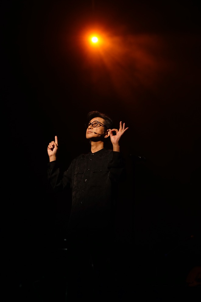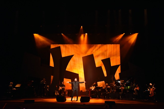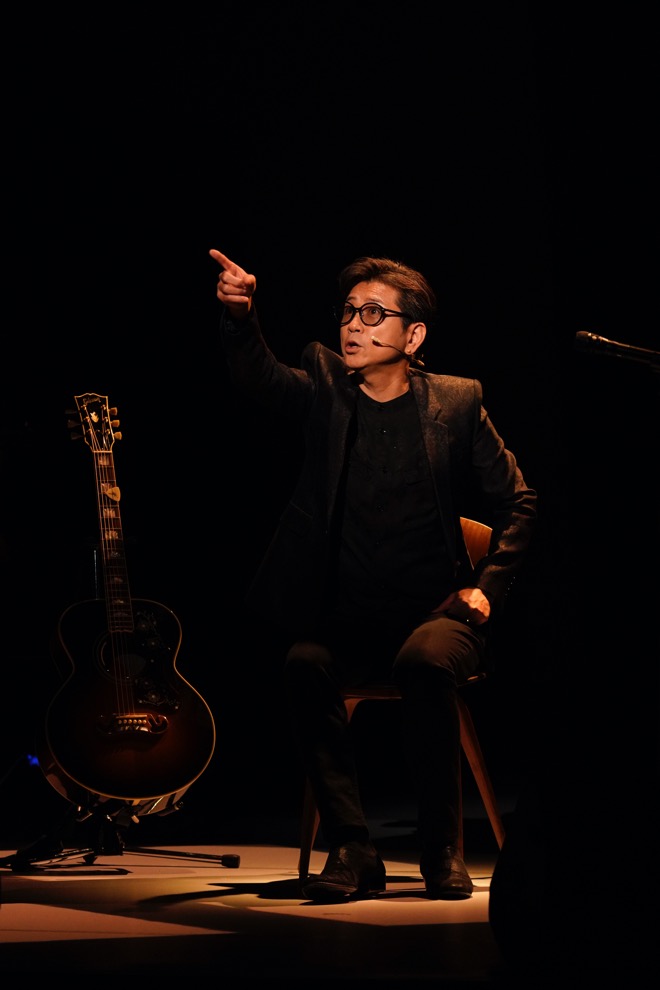 果たして通常ライブとどう違うのか? どんなサウンドや演出が待ち構えているのか? 緊張交じりの期待感の中で幕を開けたコンサートは、こちらの想像を遥かに越えた舞台芸術的エンターテイメントだった。フミヤはボーカルのみならず、曲間で客席に語り掛けながら身振り手振りを合わせて物語を展開していく。つまり自らストーリーテラーとなり、そのモノローグが終わると歌と演奏が始まる構成となっていた。