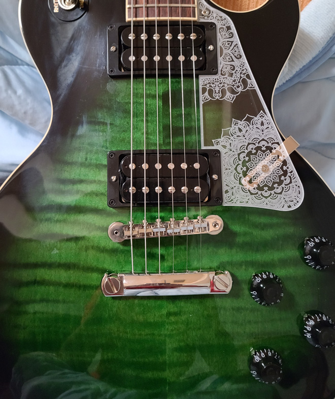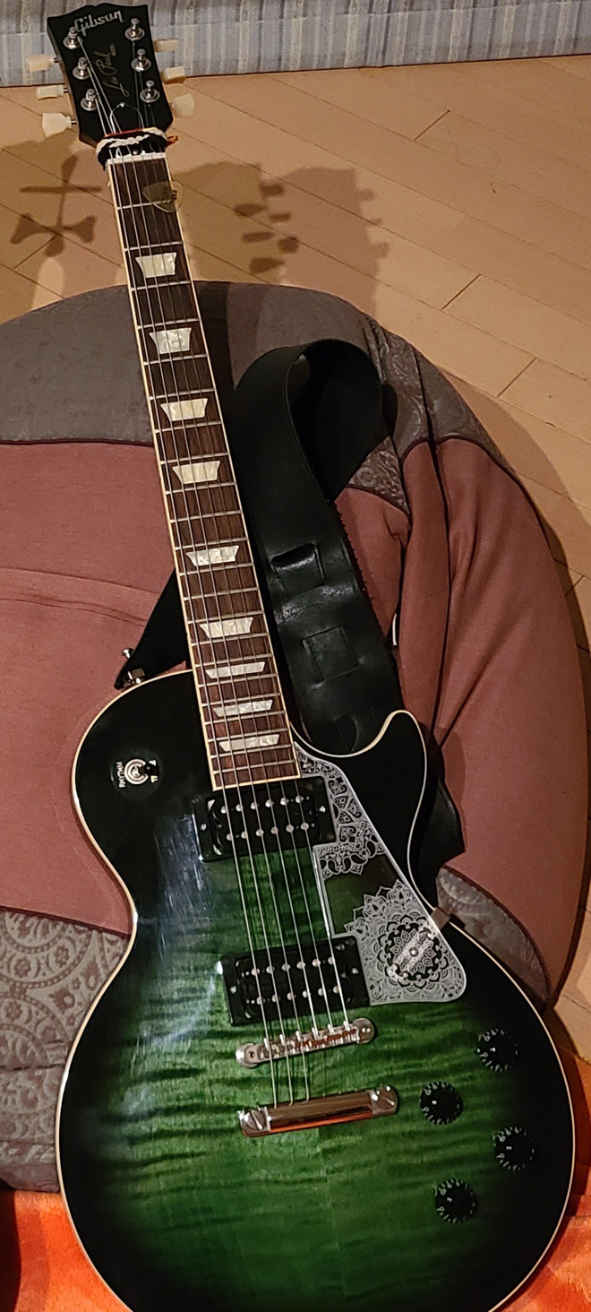 元々は黒いピックガードが付属していましたが、個人的に気に入らない&せっかくの杢目が隠れてしまう等の理由で、曼陀羅模様の入ったクリアーのピックガードを装着。エメラルドのようなボディのカラーと、エスニックな雰囲気漂うピックガードの奇跡のマリアージュにより、神秘的な美しさを醸し出しています。