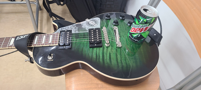 このピックガードの存在感はでかいっすね。せっかくの杢目が隠れてしまうというのは、黒ピックガードとさして変わらない気もしますけど(笑)、エレガントさが爆上がり。バイト代が貯まる前にイッちゃって大正解です。それも出会いというものですね。マウンテンデューには触れません。触れたら負けな気がしました。(JMN統括編集長 烏丸)