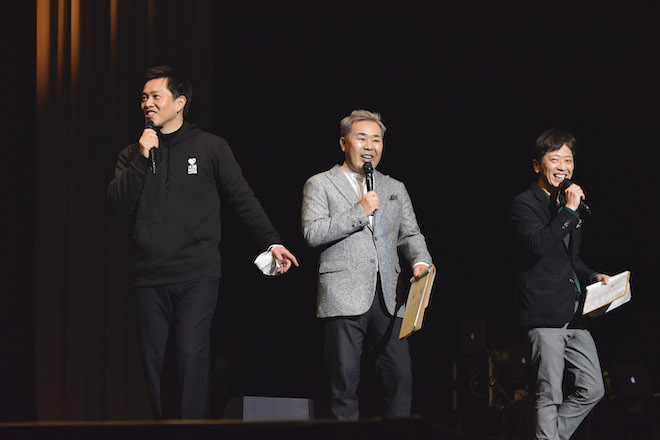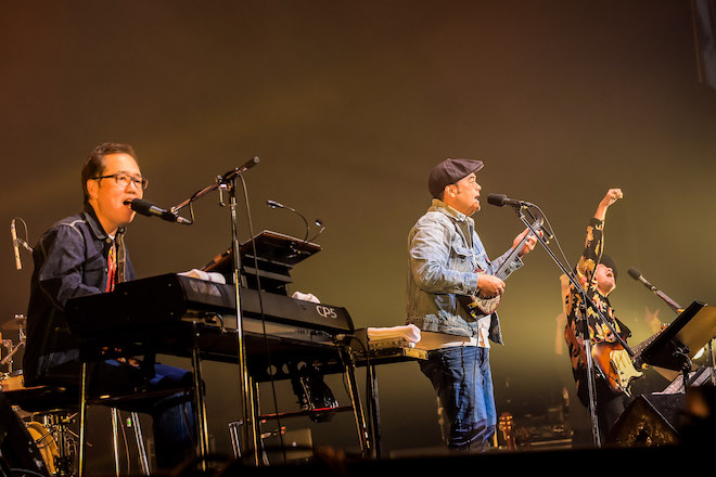 波音が響く中、笑顔で登場したBEGINが「海の声」を歌い始めた途端、場内は一気に南の島の海辺のムードに。比嘉(Vo)が、「沖縄のおばあに聞いた『島唄』の楽しみ方を教えます」と、高くあげた両手を弾むように叩く手拍子を伝授。「BEGINの中で最高のアゲ歌」という「竹富島で会いましょう」を披露すると、客席で子供が楽しそうに島唄スタイルの手拍子を打つ姿も。ジャンルも年代も超えて人を笑顔にする、音楽の力を改めて知る楽しい一時となった。
