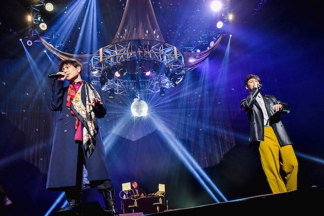 初日のトリをつとめたのは、『大阪・関西万博』の魅力を伝える「2025年日本国際博覧会アンバサダー」に任命されたコブクロ。小渕と黒田がバンドメンバーを従えてステージに登場すると、場内は総立ち状態に。感染対策で歓声を上げることは厳禁だが、自席スペースなら立つことも踊ることもオッケーだ。