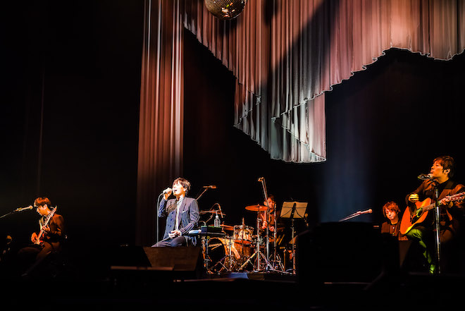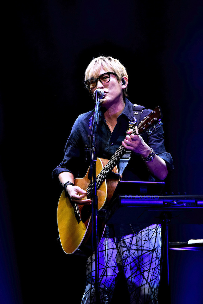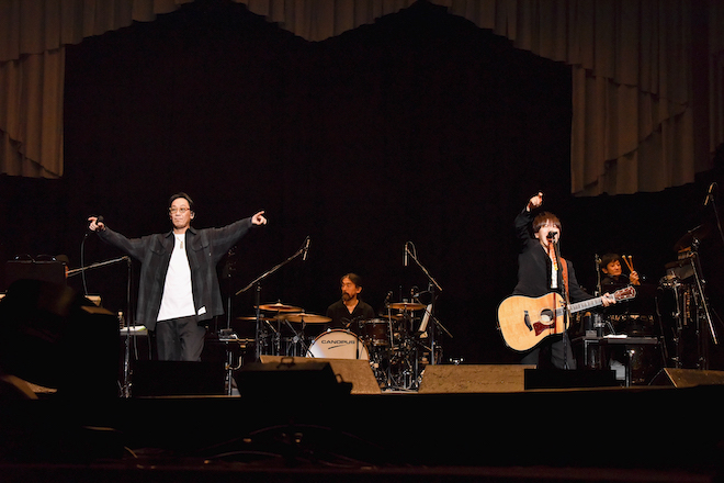 スガ シカオはたった一人でステージに立ち、自らアコースティックギターを奏でながら、「愛について」「アシンメトリー」などのヒット曲を披露。「Progress」の“あと一歩だけ前に進もう”という言葉がドラマティックに響いた後は、スリリングなギターのカッティングも印象的な「コノユビトマレ」で場内が熱狂。シンプルながら濃密な時間となった。