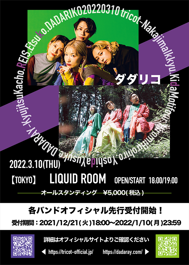 tricotとDADARAYによる対バンライブ<ダダリコ>が3月10日、東京・LIQUID ROOMで開催される。
