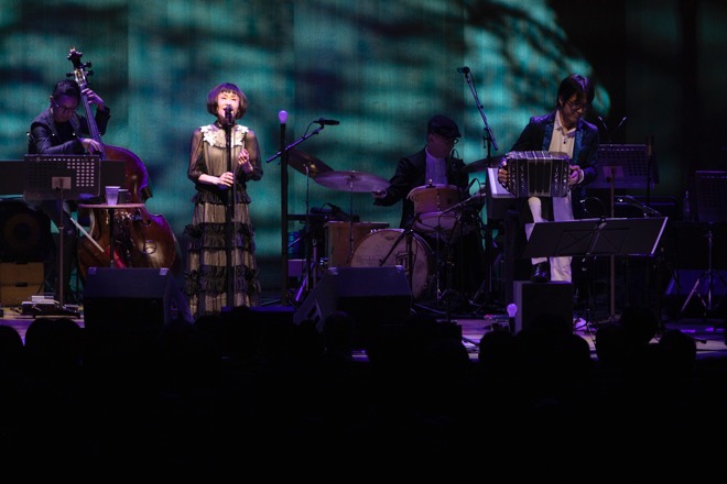 そしてゲストは二組。まずバンドネオン (アコーディオンとは別種の蛇腹楽器。それこそシャンソンでは多用されてきた)の小松亮太さん。大貫さんとは以前からコンビを組んでいて2015年には共作アルバム『Tint』で『第57回輝く!日本レコード大賞』優秀アルバム賞を獲っている。それから彦坂カルテット。これはジャズやポップスではなくクラシック系のサックス四人組。出てくる音も一般的なこの楽器のイメージとはまったく違う、たとえようものないぐらい柔らかなサウンドだった。