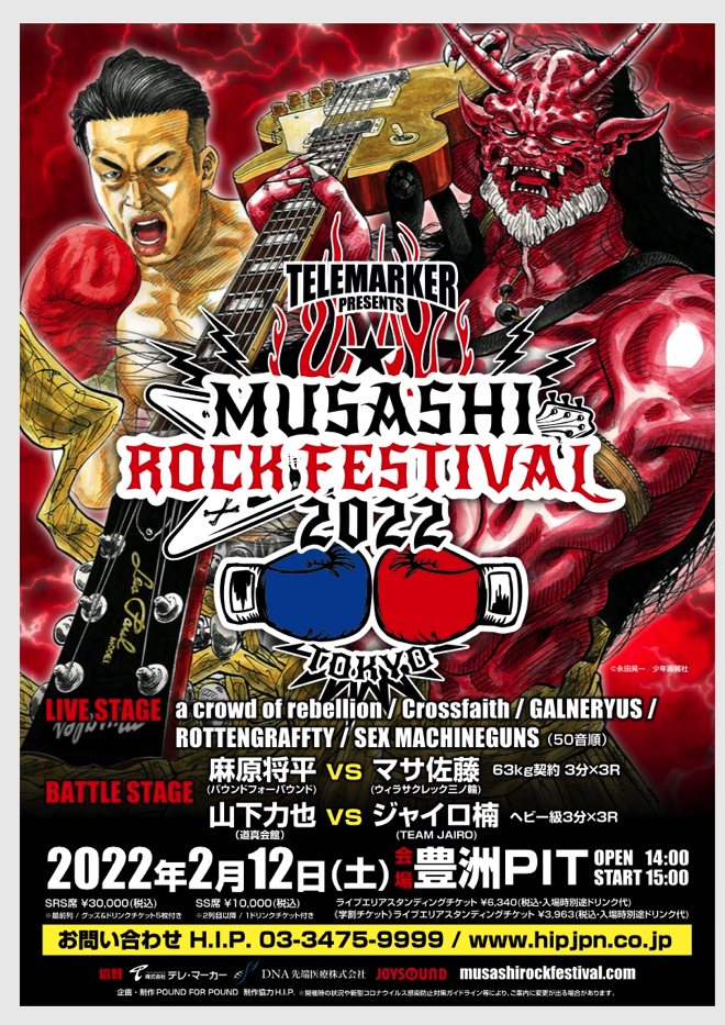 “格闘技×ロック”を掲げた<MUSASHI ROCK FESTIVAL>は、武蔵がK-1を引退した2009年に東京・Zepp Tokyoで開かれた大会が元になったイベント。今回の発表では、ライブステージにGALNERYUS、ROTTENGRAFFTY、SEX MACHINEGUNSが出演することが明らかになっている。