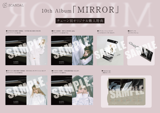 下記チェーン店、および、ショッピングサイトにてSCANDAL New Album 『MIRROR』を、お買い上げの方に、下記特典を先着でプレゼント致します。各特典ともに数に限りがございますので、お早めにご予約・お買い求め下さい。