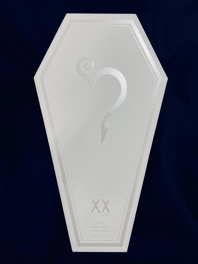 また、『HYDE COMPLETE BOX 2001-2003』の商品のヴィジュアルの一部も公開された。今回公開されたのは全体デザインのみだが、高さ310mm、幅175mm、厚み50mmという重厚で印象的な白が特徴の棺桶型のボックス、そして表面にはファンにはおなじみのROENTGENのロゴはパール箔にて押されており、早く中身が見たくなるような期待を煽る。『HYDE COMPLETE BOX 2001-2003』詳細の続報を、引き続き楽しみにしよう。