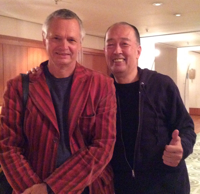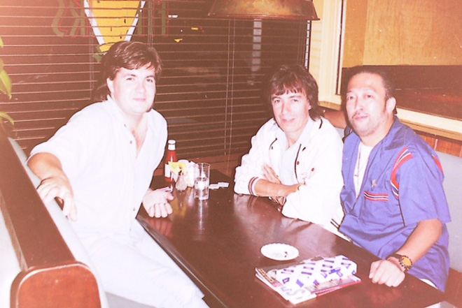 ▲30年位前、ロニー・ウッド絵画展打ち合わせでロンドンに飛んだ際に遅いランチをSFカフェでしてたらホント偶然なんだけどオーナーのビルと“久しぶり”!左はビルの息子スティーヴン君。 from Mile’s Photo Album