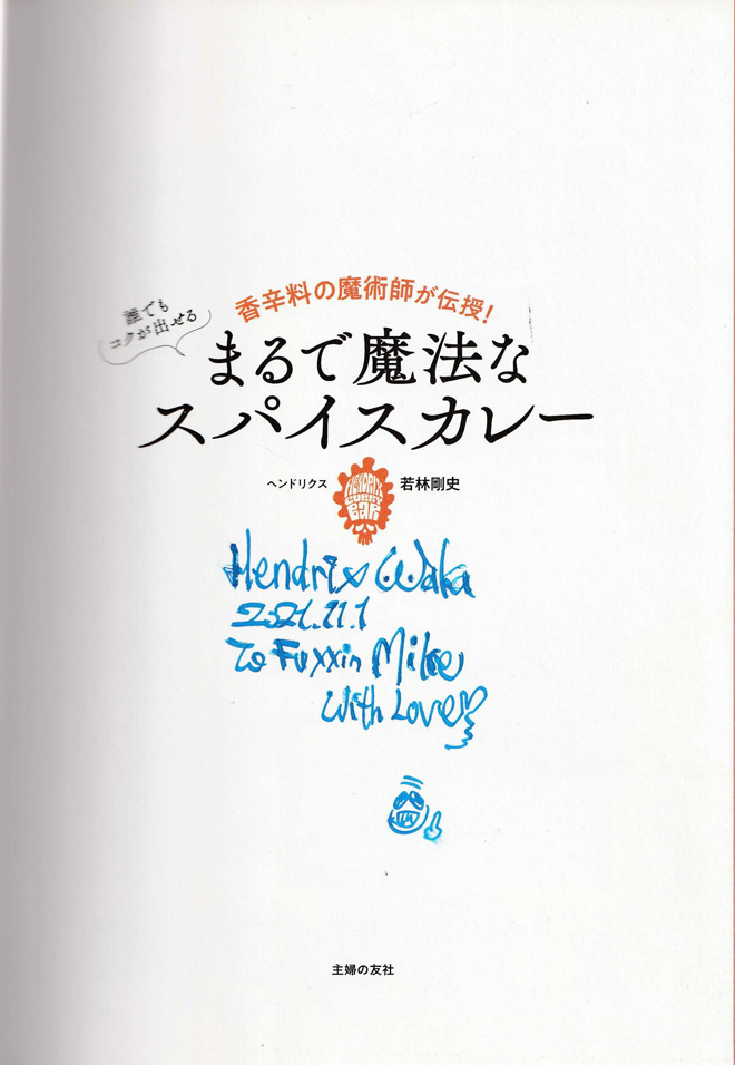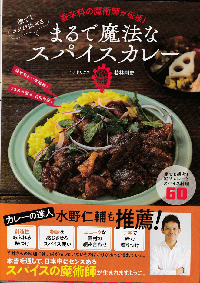 そんな若林が僕らカレー・フリークから注目の一冊が登場、『まるで魔法なスパイスカレー』(主婦の友社)だ。ヘンドリク・オリジナルの“基本のミックススパイス&調味料”から始まり、チキンカレー、キーママトンカレー、ポークカレーetc数多くのカレーのクック法が紹介されている。因みに僕はポークカレーでにすった大蒜&カイエンペッパーを大量に加えたMike’s versionをお願いする。
