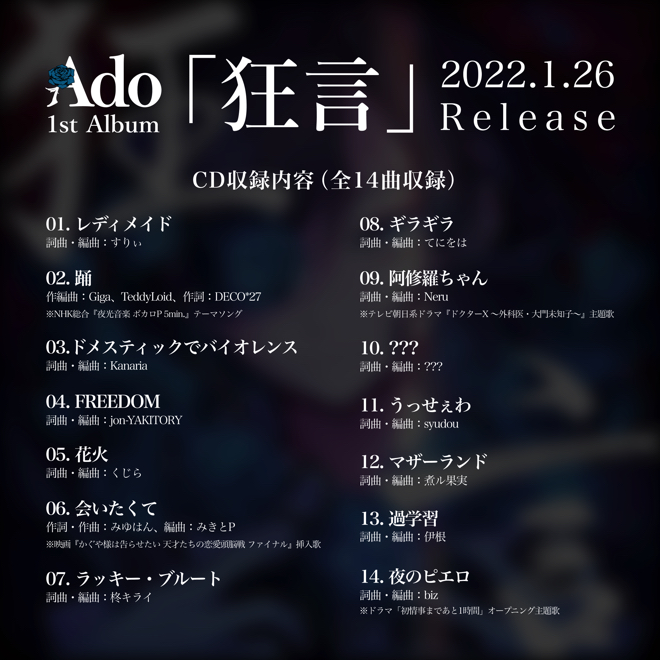 Adoが1月26日にリリースする1stアルバム『狂言』のトラックリストが公開された。