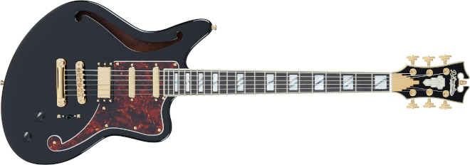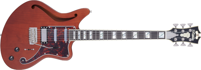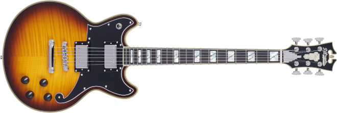 Deluxe Bedford SHは、オリジナル・オフセット・ボディー・シェイプを基本に6弦側に大きなfホールを備えたセミソリッド構造が特徴で、セイモア・ダンカンのピックアップをSSHでレイアウト。ヘッドストックとネックには3プライのバインディングが装飾され、ボディーはアルダー、メイプル&ウォールナットの3ピース・ネックにエボニー・フィンガーボードといったウッド・マテリアル。24.75インチのスケールを採用し、ネックはメイプルの間にウォールナットを挟んだ反りや捻じれに強い3ピース構造となっている。