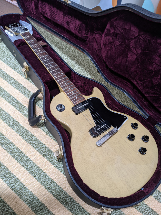 学生時代から憧れているBUMP OF CHICKEN 藤原基央さんが使うあの黄色いレスポールスペシャル、今しかねぇ!と言う事でネットを物色。人気機種だがらでしょうか、1957年のリイシューは出てくるのですが1960年のリイシューがなかなか出てこない!探す事2ヶ月…ようやく発見!大阪に取り寄せてもらい試奏して即決!極太ネックが最高の黄色い相棒がやって参りました。