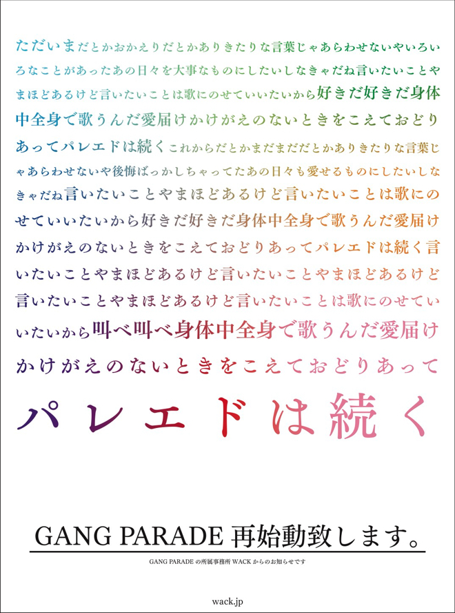 GANG PARADEは2020年3月に“分裂”を発表し、“GO TO THE BEDS”と“PARADISES”という2つのグループとして活動してきた。1月1日、読売新聞の朝刊には“GANG PARADE再始動致します。”と所属事務所による広告が掲載された。メンバー本人たちもこの新聞広告で初めて再始動を知ったそうだ。