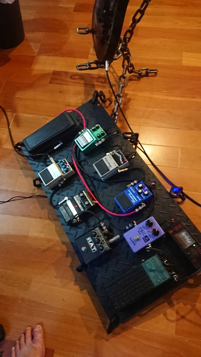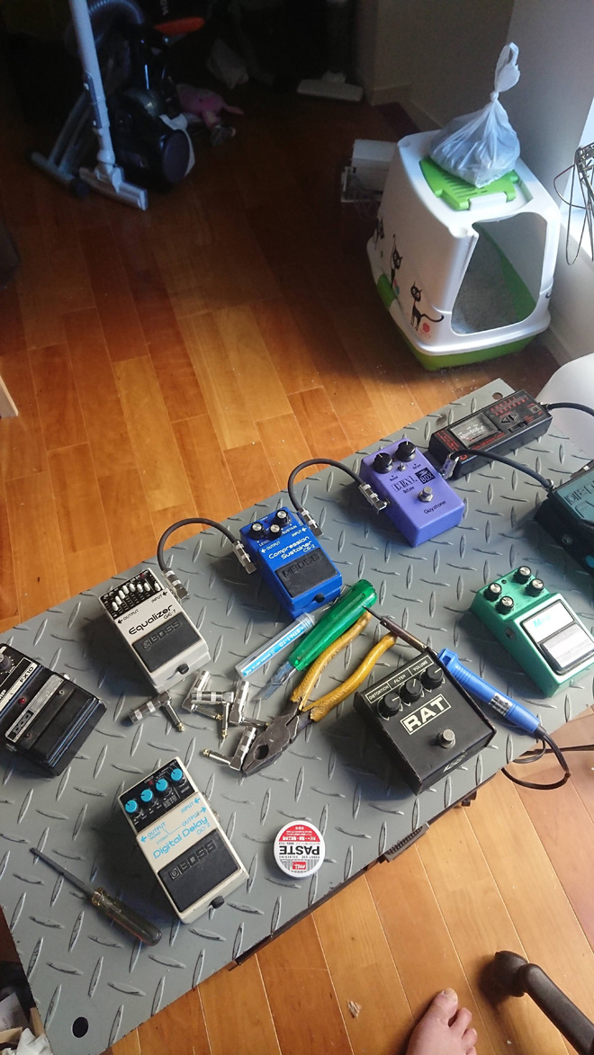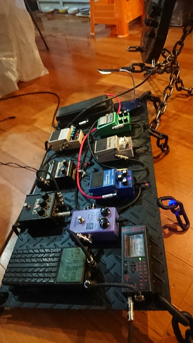 DODのワウ以外バリバリ使えて、よしッエフェクターボード作ろう~と!仕事で出た残材の鉄板でエフェクターの位置をキメて、鉄板の裏にACアダプターつけて エフェクターの渡りのシールドはベルデンでジャックは普通の奴。配線が本当に大変だったかな。最後に板ぞこにLEDつけてピカ~ん!毎日ギター引くたびにアゲアゲ!ロックンロール