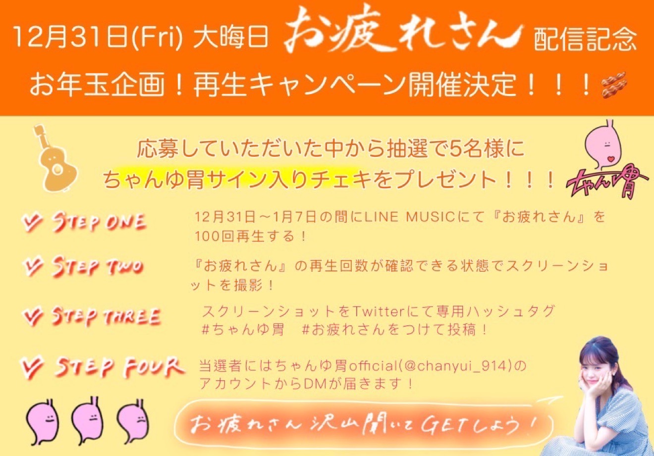 さらに、リリースを記念して12月31日〜1月7日の期間「お疲れさん」再生キャンペーンが開催され、LINE MUSICで100回再生したスクリーンショットと専用ハッシュタグ“#ちゃんゆ胃 #お疲れさん“をつけてTwitterに投稿すると当選者にはサイン入りチェキのお年玉プレゼント企画が行われることも発表されている。