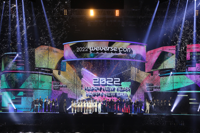 HYBEが2021年12月31日に京畿道高陽市のキンテックスで開催した<2022 Weverse Con>が盛況裏に終了した。 公演にはBUMZU、Dvwn、ENHYPEN、fromis_9、ジャスティン・ビーバー、イ・ヒョン、SEVENTEEN、TOMORROW X TOGETHERなどが参加し、計42曲で約230分を満たした。オフライン公演と共にオンラインライブストリーミングで同時に行われた今回の公演は117か国/地域の音楽ファンが視聴した。