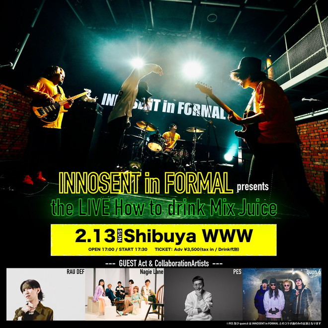 INNOSENT in FORMALが2月13日(日)に東京・渋谷WWWで開催するイベント<INNOSENT in FORMAL presents the LIVE How to drink Mix juice>の出演者が発表された。