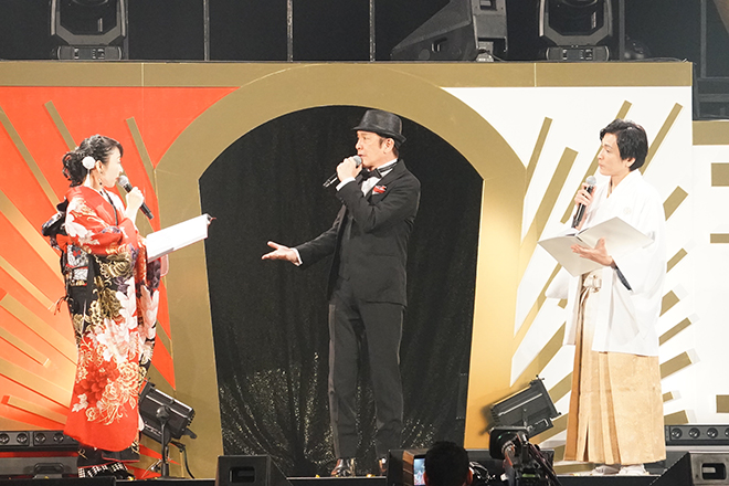 ここで前半戦は終了。歌合戦を小休止して、個性豊かな声優たちのコラボコーナーを実施することに。まずはお正月ということで、あなたが好きなおせちのメニューはというアンケートをTwitter投票機能で実施。その後、“中田譲治のBarジョージ”と題したスペシャルコーナーが展開された。ゲストバーテンダーとして小野友樹が登場し、劇団グワィニャオンから誕生したスペシャルユニット「愛染終と東京ニューセレクト」(遠藤純一、山口勝平、魚建、尾形雅宏、西村太佑)がムード歌謡「血風リトルトーキョー」を。続いて井上喜久子がゲストバーテンダーとして登場し、島本須美、笠原弘子が『魔女の宅急便』エンディングテーマ「やさしさに包まれたなら」を初デュエットで歌いあげた。そして締めくくりは、ゲストバーテンダーとして山本和臣が登場し、山口勝平と関智一が『機動武闘伝Gガンダム』の主題歌「Trust You Forever」を披露。会場を一体感に包み込んだ。中田も「どうでしたか皆さん?本日だけ、この場だけの化学反応を楽しんでいただけたのではないかなと思います」と満足げな様子で語った。