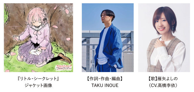 リリースが決定しているのは、TAKU INOUEが作詞と作曲、編曲を手がけた雁矢よしの(CV:高橋李依)の「リトル・シークレット」と、かめりあの作詞作曲、編曲による金魚鉢たより(CV:芹澤優)の「ハジメテタヨリ☆」、Tomgggが作編曲を担当した水茎あやめ(CV:楠木ともり)の「よあけのあやめ」の3曲だ。各日22時より公式YouTubeチャンネルでミュージックビデオがプレミア公開され、音楽配信サービスでの配信も開始される予定となっている。リリース当日の21時20分からは、YouTubeを通じてコンポーザー陣が出演する特別番組が配信されるそうだ。
