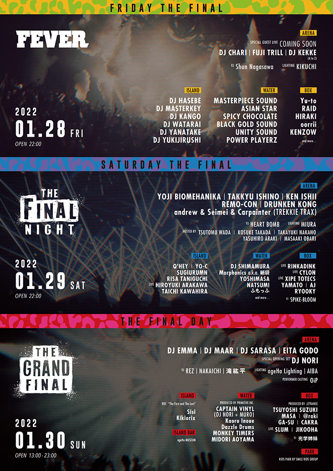 1月30日(日)の<THE GRAND FINAL>は、幅広い世代、多くのファンに<ageHa>を体感してもらいたいという願いを込め、未成年も入場可能なデイタイム開催(13:00-23:00)。会場からの生配信も予定しており、詳細は後日発表される。