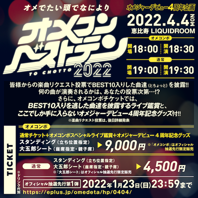 オメでたい頭でなによりがメジャーデビュー4周年を記念して、4月4日(月)恵比寿 LIQUIDROOMにて、初のリクエストライブ<オメコンベストテン とちょっと 2022>を開催することが決定した。