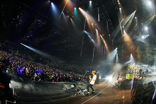 終盤戦は、これを聴かないと終わらない「ROSIER」が熱狂へと導き、INORANがセンターでリフをストロークする「TONIGHT」へ。躍動感溢れるアクトが不変の輝きを放つ。そして本編が終了。SUGIZOはRYUICHIが脱ぎ捨てたジャケットを羽織り、生声で「ありがとう」と何度も叫んだ。会場を照らすスマホの光が宇宙空間を演出たのがアンコールだ。
