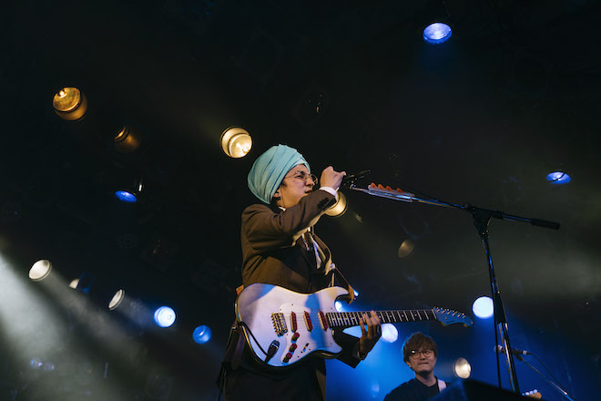まずはマハラージャンが登場。ターバンを頭に巻き、セットアップのスーツに身を包んだアイコニックな装いでステージへ姿を現わす。1曲目の「何の時間」からしてマハラージャンのカッティングが冴え渡る。というか、サポートメンバーも全員とんでもなく上手い。ビンテージのシンセサイザーが並んでいる様子は、サウンドだけでなく見た目も壮観である。バンドが醸し出すグルーヴ感と、スキルの高さは1曲目で重々理解できた。リスニング・ミュージックとしてだけマハラージャンの音楽を聴いていると分からない充実感がある。オール・イン・ワンのプロデューサーとしてひとりで活動していると、メディアで取り上げられるのは多くの場合その人だけだが、ライブになると新たな発見が度々ある。今回はまさにそういう体験だった。