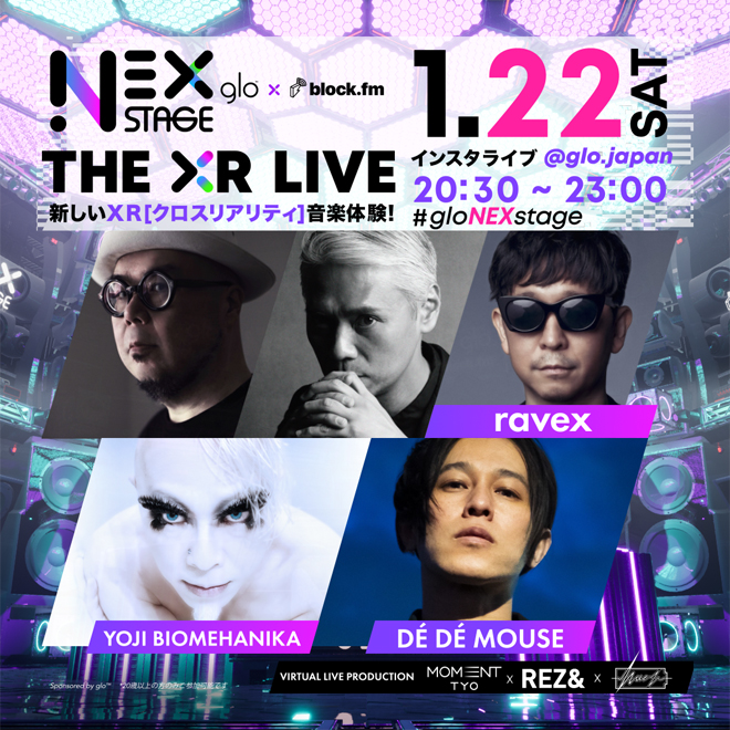 今回のNew Year Event<glo NEX STAGE presents THE XR LIVE>に登場するのは、メロディカットアップの手法とキャッチーで不思議なメロディ/和音構成は、国内外問わず多くのフォロアーを生み、以降のシーンにひとつの発明とも呼べる功績をもたらすDÉ DÉ MOUSE。そしてMondo Grossoの大沢伸一、FPMこと田中知之、m-floの☆Taku Takahashiの3人のプロデューサーによる“ダンスミュージックとJ-POPの新しい融合”、“21世紀のJ-POP”をコンセプトに2008年に結成されたドリームチームravexが「THE XR LIVE」で復活する。さらに、アンダーグラウンドだったハードなダンスミュージックをメジャーなマーケットに押し上げ、数々のオリジナル・ビッグアンセムと唯一無二のステージ・プレゼンスを武器に、世界のシーンからレジェンドと讃えられるYOJI BIOMEHANIKAが登場する。