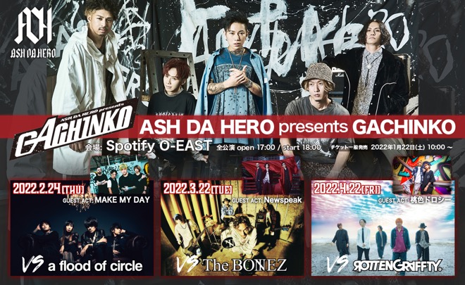 ASH DA HEROは2月から4月までの3ヶ月連続で、自身主催対バンライヴイベント<GACHINKO>を開催することも決定している。その対バン相手が豪華ロックバンドたち。2月24日は“ASH DA HERO vs a flood of circle”、 3月22日は“ASH DA HERO vs The BONEZ” 、 4月22日は“ASH DA HERO vs ROTTENGRAFFTY”。場所はいずれも東京・渋谷Spotify O-EASTだ。チケット一般発売は1月22日午前10時から。
