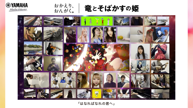 この映像は、「前を向くすべての人を、音楽で応援したい」との想いのもと、ヤマハが展開している「おかえり、おんがく。」企画の一環で制作されたもので、『竜とそばかすの姫』の主人公すず/ベルの歌唱シーンなどが参加者から寄せられた動画とともに映し出され、映画の世界観そのままに歌唱や演奏を楽しむことができる。共演の楽しさを通して、歌や楽器の演奏の楽しさや喜びを改めて再認識させてくれる好コンテンツだ。