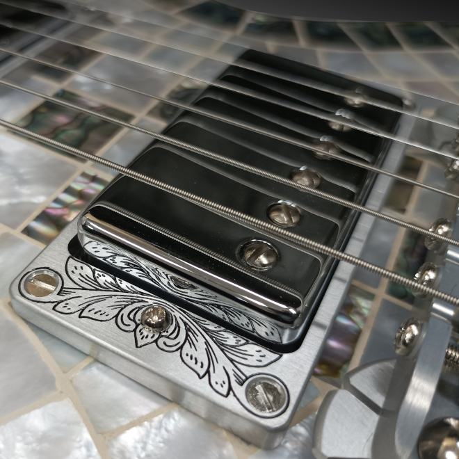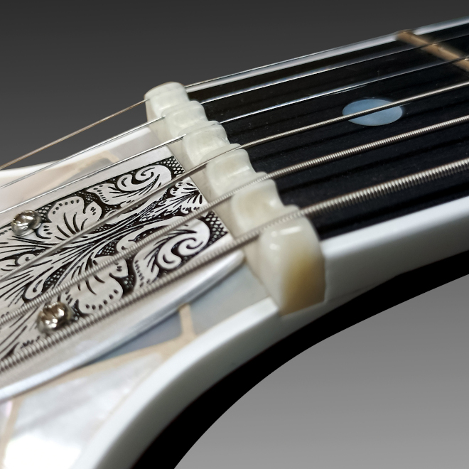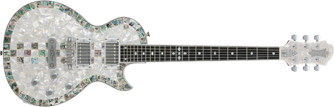 THE PORTRAIT Pearl Front Ring Chessは、ボディー・バックに厳選されたマホガニーを採用し、ボディー・トップにマザー・オブ・パールとソリッド・アバロンを使用した豪華な装飾をしたゼマイティスならではのデザイン性の高いモデル。厳選されたアフリカン・マホガニーを使用したネック、エボニー・フィンガーボードといったウッド・マテリアルにゼマイティス・オリジナルのアルミ合金を使用したブリッジ&テイルピースやピックアップ・リングを組み合わせることで、脈々と続くゼマイティスのパール・フロント特有のトーンを継承している。