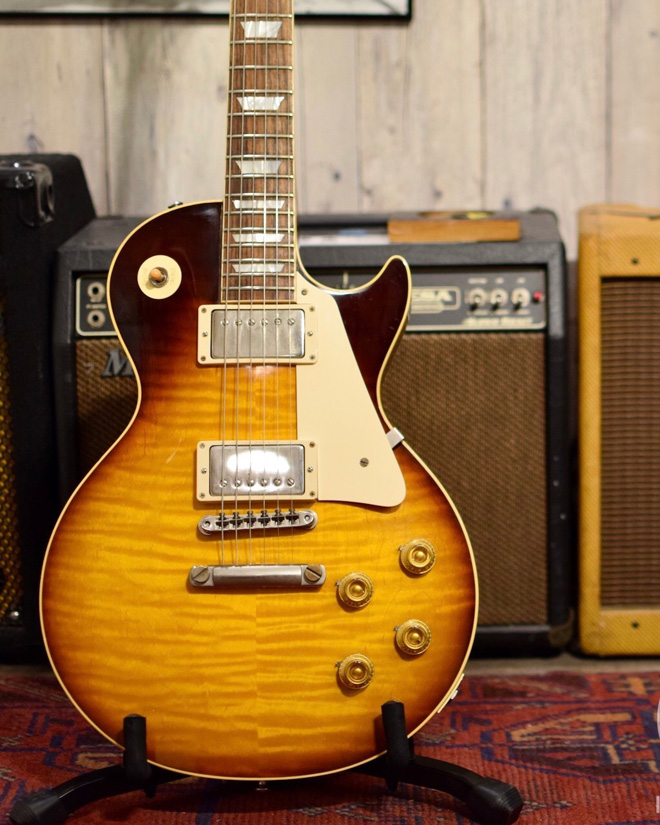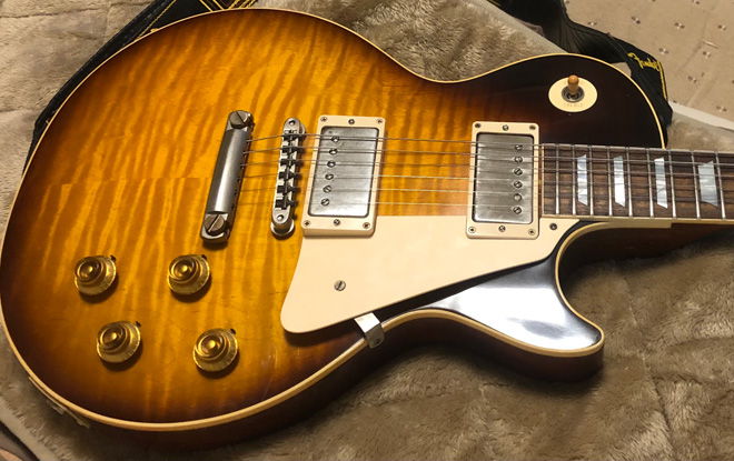 初めて生のタバコバーストを見た瞬間だった。思わず涙が出たね。B’zのTAKのAQUABLUEを見た時以来の衝撃だ。ギブソンの職人はトップが飴色に焼け着いた色を上手く再現してたんだよ。やってくれたよ本当に。素人の俺でもあのギターには魔法がかかってると悟ったよ。特徴的なボリュームノブ付近の削れも再現されているしね。