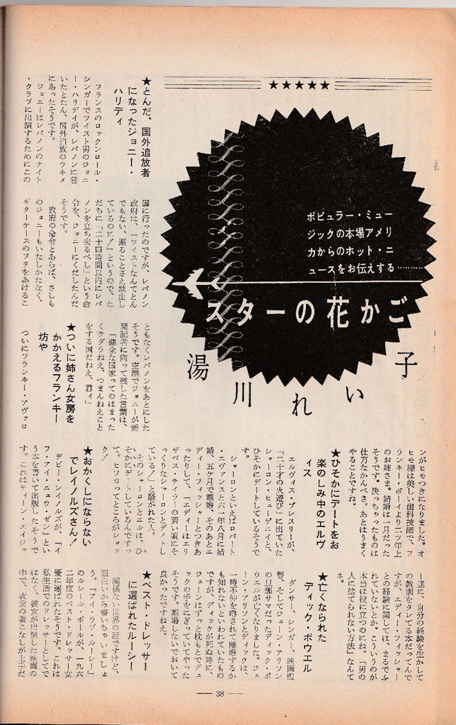 63年3月号“スターの花かご”中盤から後半にかけては僕の大好きなエルヴィス ・プレスリー(この月は2回も…流石です!)やジョニー・ティロットソンの話題も登場。ジョニーといえば66年の映画『涙くんさよなら』(主演:ジュディ・オング)に出演していたけど、この作品中でTVワイドショー“湯川れい子モーニング・ショー“で彼がインタビューを受けるシーンがある。そう、れい子先生の映画初出演作品なのだ。この映画にはその後親交を深めた故・ムッシュかまやつ、故・井上堯之、加藤カッペチャン充らの在籍していたザ・スパイダース、そしてジョニー同様ずっと後にインタビューした故・山内賢も出演していた。