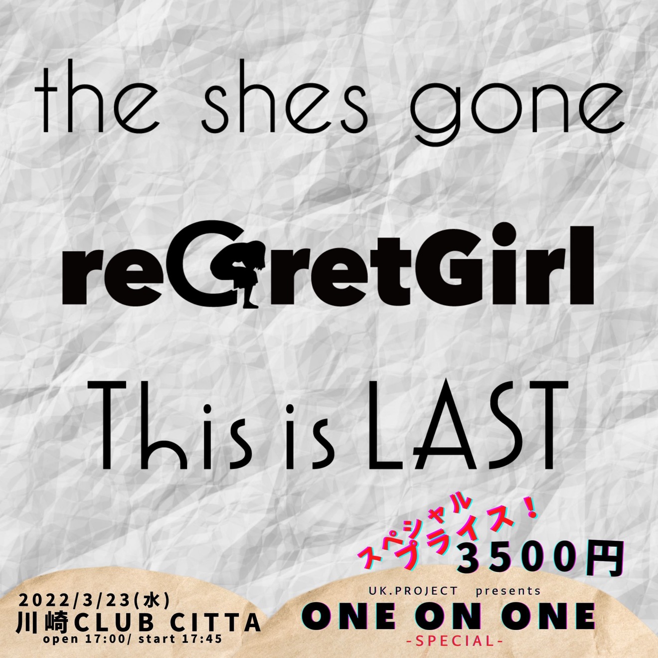 UK.PROJECT主催のイベント<ONE ON ONE>が2022年3月で1周年を迎える。これに伴い、1周年記念ライブとしてthe shes gone、This is LAST、reGretGirlによるスリーマン公演が川崎CLUB CITTAで開催されることが決定した。