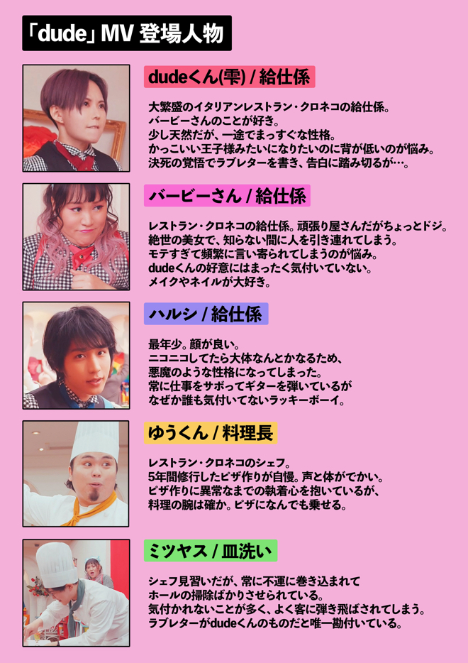 1月26日に配信リリースされた「dude」は、自身の出身地である福岡をPRするキャンペーン<ふくおか避密の旅+>のテーマソングに起用されている楽曲だ。ミュージックビデオではメンバーそれぞれが「レストラン・クロネコ」の従業員に扮し、雫(Vo,G)演じる“dudeくん”とヒロインの恋が成就するまでのストーリーが描かれる。ヒロイン役はフォーリンラブのバービーが演じた。