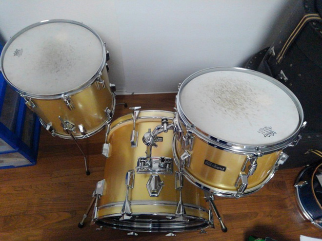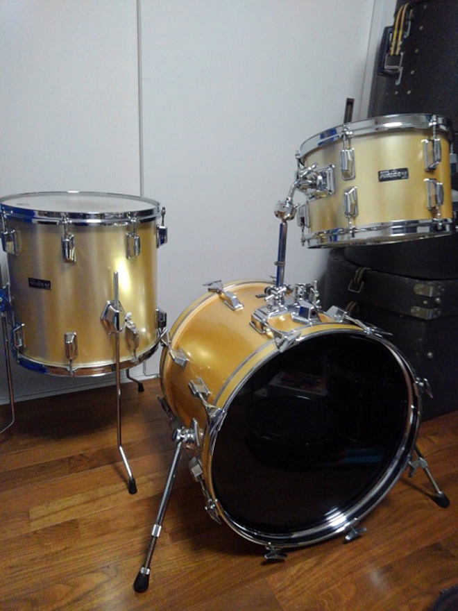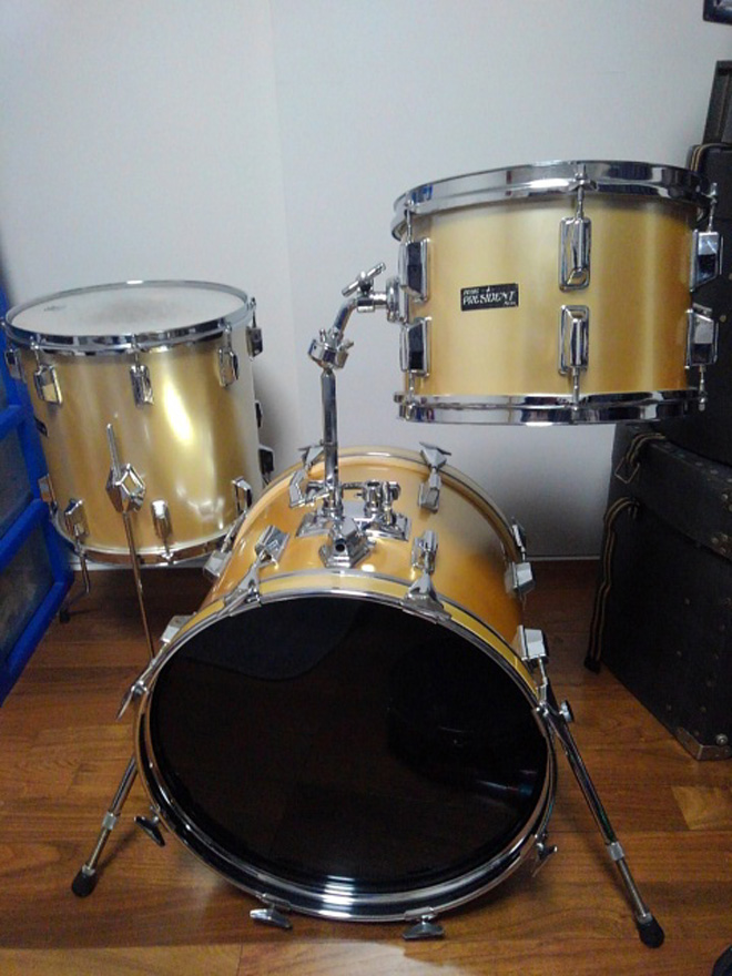 前から自分自身と同じ位の年代のドラムセットを探していたのですが、とうとう出会いました~!1970年代中期くらいのパールのプレジデントです~。しかも18インチバスドラムのセットは珍しいのではないかと思います!