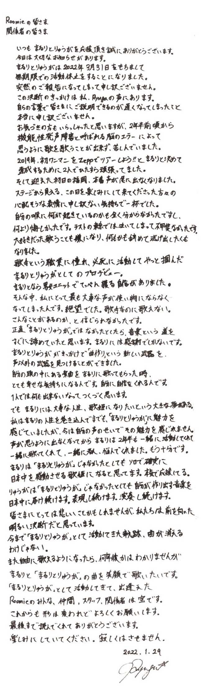 彼らは1月29日に配信したInstagramライブで活動休止を発表。2年半前頃から機能性発声障害のため思うように歌を歌うことができなくなっていたというRyugaは、まるりとりゅうがとしてふたりで歌うことができないまま活動を続けていくことはできないと考え、この決断に至ったと説明した。