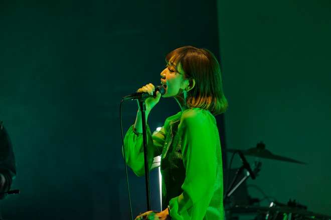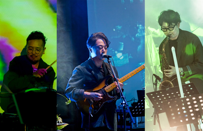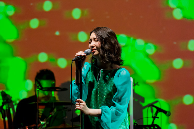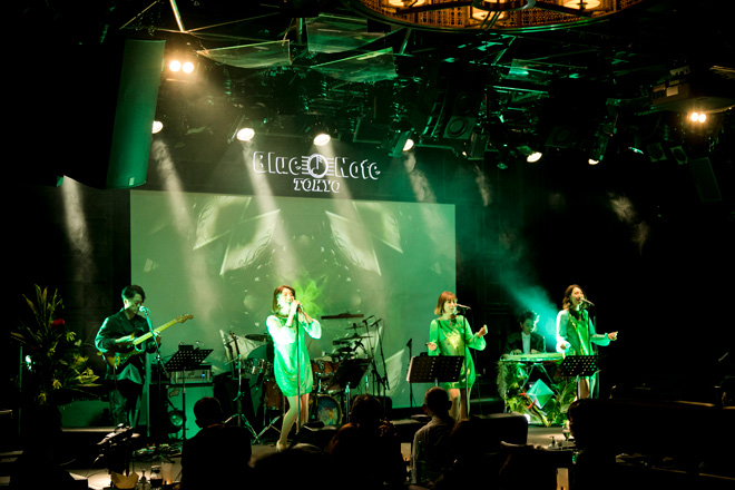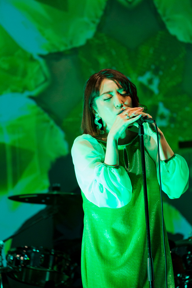 まず、楽器のメンバーがステージに登場。スティール・ギター担当のJINTANA。エレキ・ギターにカシーフ。この日はトラックメーカーのXTALがお休みで、代わりにサポート・ドラマーにマルチ・プレイヤーの南條レオが参加。続いて、3人のシンガーがステージに向かう。名作『CITY DIVE』(2012年)以降、現在進行形のシティポップ・シーンを牽引する一十三十一。K-POPや日向坂46などに詞曲を提供するソングライターのカミカオル。そして、MimeやTokimeki Recordsで活躍するひかりが新たに加入。エメラルド・グリーンの揃いのワンピースがステージに映える。