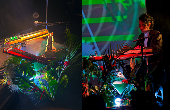 こだわりという点で言えば、ステージの背景にVIDEOTAPEMUSICによるVJを映していたことも挙げられるだろう。様々なVHS素材から作り出した映像は、その質感そのものにレトロな味があり、この日のライヴのムードを作り出す重要なエッセンスになっていた。もうひとつ、自分の席からは見えにくく後で知ったのだが、JINTANAのスティール・ギターのスタンドは、エメラルドをイメージした三角形の8面体が回りながら光るというもので、加藤ユウのデザインをNEST DESIGN STUDIOが制作したというオリジナルなもの。このように至るところにバンドのコンセプトに則った徹底的な拘りが見られ、世界観を作り出していた。