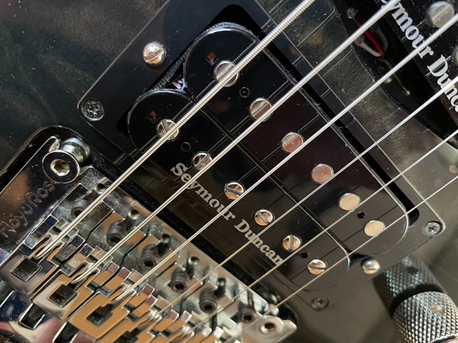 24フレットの場合、フロントもパワフルであってほしいと考えると、シングルサイズのハムを起用したHSH一択となりますよね。機能性の高さもさることながらキルトもカッコいいなあ。ホコリが溜まりやすいピックアップ周りやブリッジ周辺もピカピカで、とても気持ちいい。丁寧に愛されていることが伝わります。(JMN統括編集長 烏丸)