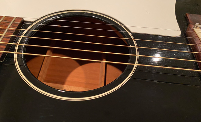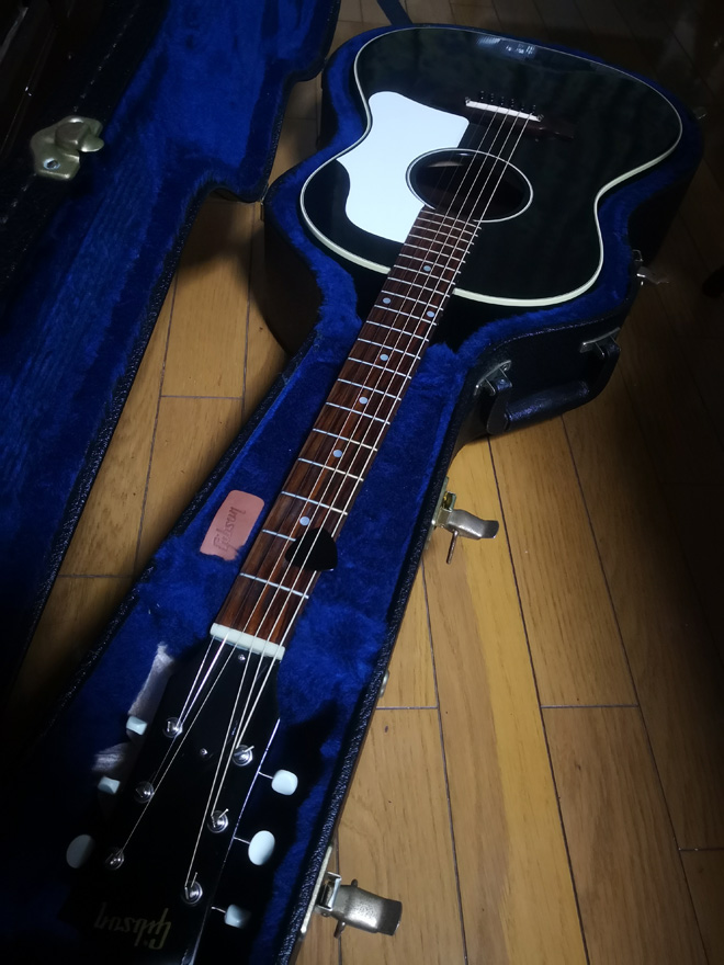 そんなある日、地元の楽器店に何となく立ち寄った僕は、1本のギターに目を奪われた。異様な存在感を放って黒く光る少し小ぶりなボディ、そして何と言ってもヘッドに輝く「Gibson」のロゴ。「黒いJ-45なら見たことあるけど、B-25なんて見たことないぞ……。」