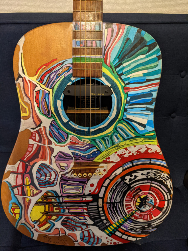 数ヶ月前のある日、このギターに出会いました。画像の通りアートが施された特別なデザインに圧倒されました。大きなエネルギーが渦を巻き、うねりを上げるような唯一無二のアート。