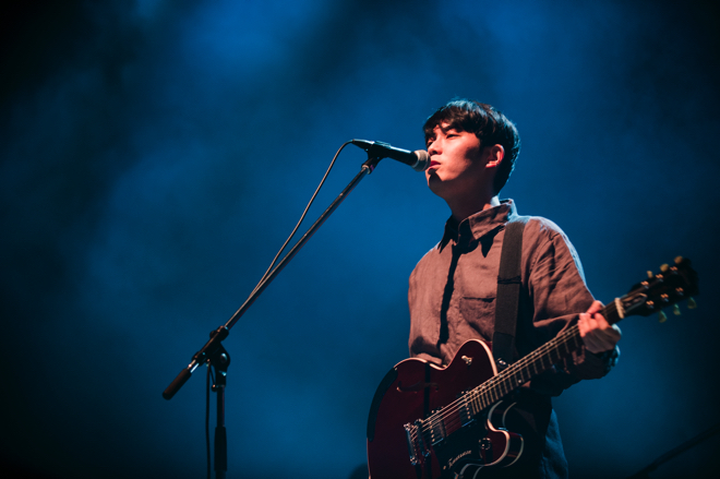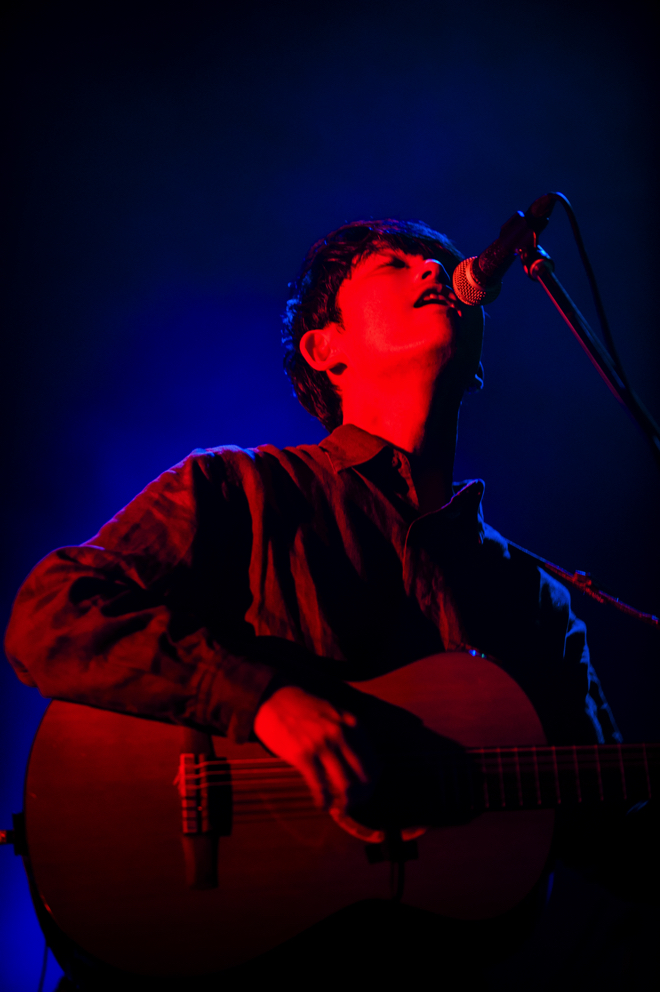 海の底、あるいは奥深い森を思わせる暗く闇に沈んだステージ。楽器の発する音なのか生き物の鳴き声なのか判別がつかない、謎めいた音が響いている。幕開けの「kohei」から、「爆発」「心」「悪魔」の4曲は、アルバム『心理』収録曲を続けて披露。穏やかな波のようなピアノフレーズで始まったのは上述の「朝顔」。客席の壁面には影絵の花のようなライトが投影される。繊細な心情を描きつつも絶望に陥らず、差し込む光を感じさせる名曲。折坂は柔らかな笑みを浮かべながら歌い奏でていた。続く「針の穴」では観客にハンドクラップを誘う場面も。かといって、通常のライブでよくある“一体感を求める”という距離感のアクションでもない。暗闇でギターを鳴らしながらの独唱でスタートした次曲「トーチ」以降、ほぼ最後まで、ステージ上は日常世界から切り離された、観る者を深く引き込んでやまない神秘の空間となっていた。