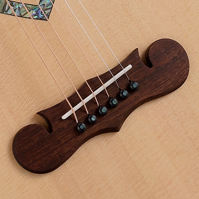 ボディーは、板材の時に真空状態で熱を加えることで余分な水分やミネラルを取り除いたソリッド・シトカ・スプルースをトップに、サペリをサイドとバックに使用。トップ・ブレイシングは、最大限の鳴りを引き出すためにサウンドホールの形状やボディーのサイズを考慮して設計したフォワードXブレイシングを採用している。