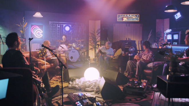 ドラマーは普段のライブ通りドラムセットでプレイするが、そのほかのメンバーはソファに座ったままで演奏。これは両バンドとも初めての経験のようで緊張感がありつつ、またお互いの演奏をかぶりつきの特等席で見る贅沢さは格別のようで、グイグイとテンションが上がっていくのが分かる。演奏中は、お互いいちファンに戻って頰が緩んだ無邪気な表情を見せている。