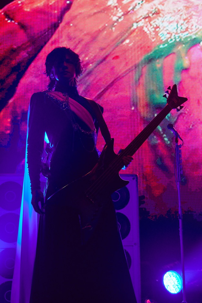 その「G.D.S.」のビートに導かれるようにしてステージ上に登場したメンバーたちが、次々と配置に就く。この特別な機会の1曲目に彼らはいったい何を演奏するつもりなのか? その場にいたすべての人たちの関心がそこに集中していたに違いない。そしてこのSEの終盤に生演奏が重なり、爆発的なクロージングを迎えた次の瞬間、Shinyaが鞭を打つようにドラムスティックを操る。その一瞬だけでこの夜のオープニング曲の正体を察知した観客も少なくなかったことだろう。最初の一撃は「THE IIID EMPIRE」である。