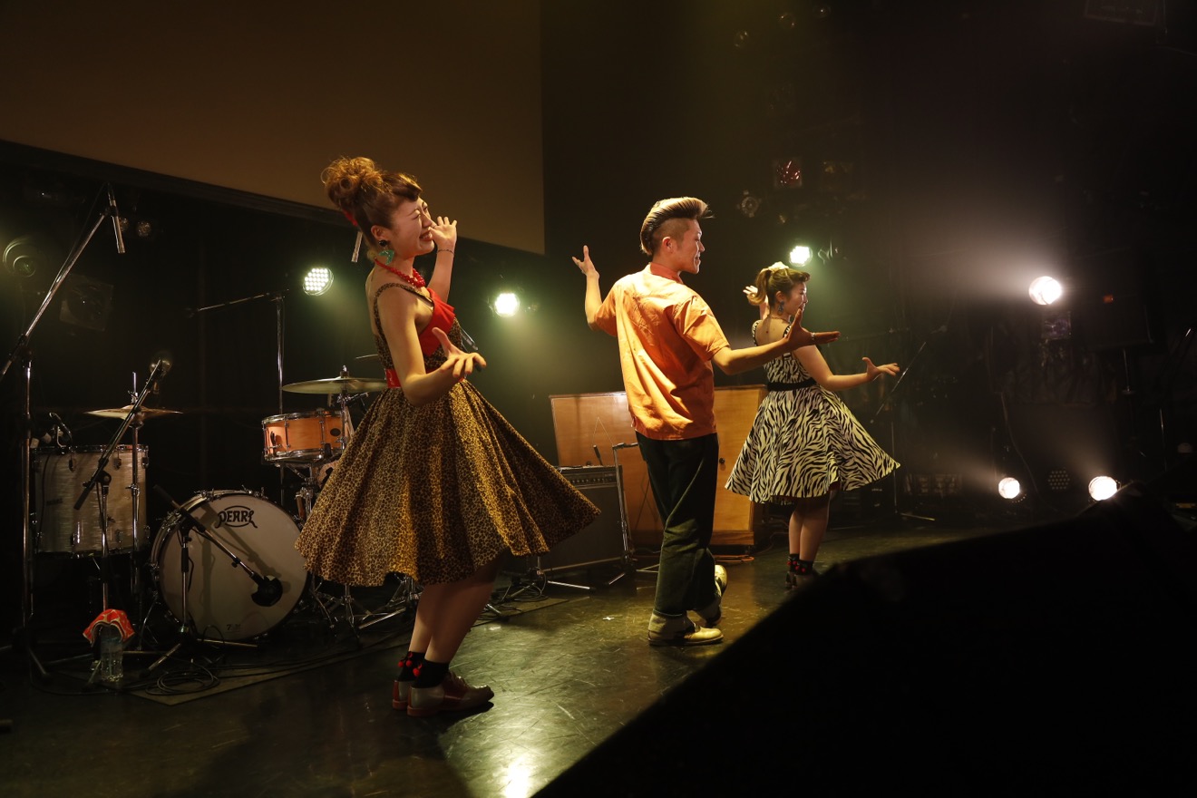 トップバッターは飾ったのは、親戚だけで構成されたオールディーズダンスチーム・Good Spirits。オリジナル曲はもちろん、映画『ブルース・ブラザーズ』でもお馴染み「Shake A Tail Feather」や親交深いJohnny Pandora(ジョニー パンドラ)の「Crying for the Moon」、メンバーである久米浩司(BLACK CATS/MAGIC)も観ている空間でBLACK CATS「夢のビックマシン」等々の名曲群をあらゆるジャンルのダンスパフォーマンスでお届けし、会場をポップに明るく盛り上げていく。