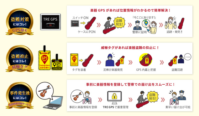 (3)の楽器情報登録サービスが専用システムで登録・保管が可能となったことで、あらかじめ楽器の製品名・シリアル番号・保証書番号などを登録しておくと、紛失・盗難発生時に警察での届け出がスムーズに行うことができる。