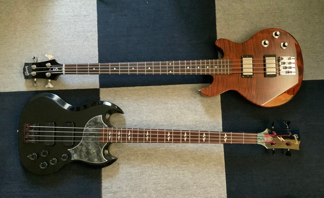 Gibsonのベースならサンダーバードをイメージされる方が殆どでしょうけど、私が選んだのはちょっと変わり種のSGとLesPaulで私自身、基本的にはノーマルのオリジナル派ですがSG-Zはサーキットをいじって5ノブ仕様、LesPaulの方はビンテージのZemitas等に使われていたノブに交換しています。SGはやはりJack Bruceの影響でしたね。