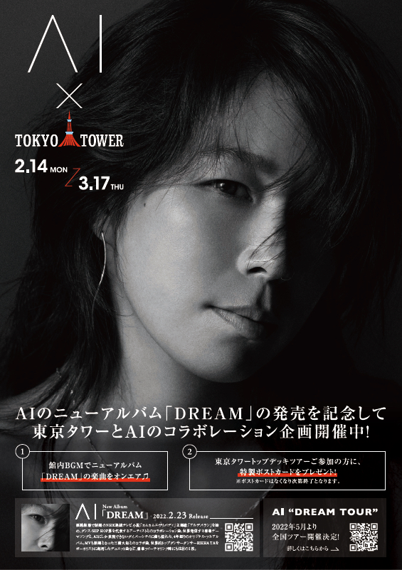 AIと東京タワーのスペシャルコラボレーションが2月14日にスタートした。23日発売のニューアルバム『DREAM』に収録される楽曲が、フットタウン構内や正面玄関前で放送される。